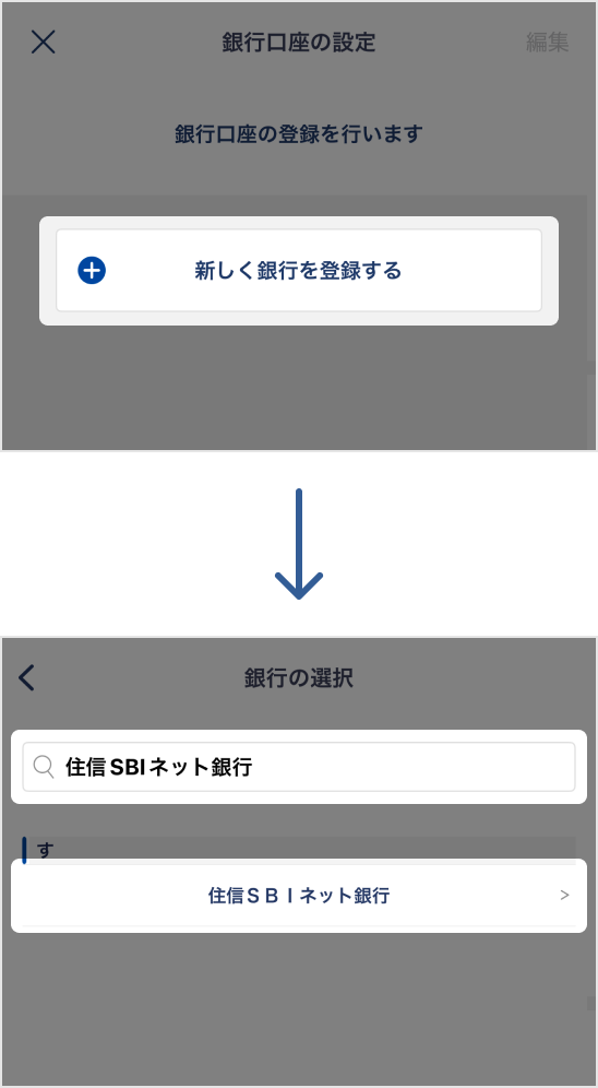 「新しく銀行を登録する」をタップ。「住信SBIネット銀行」で検索し、「住信SBIネット銀行」を選択してください。