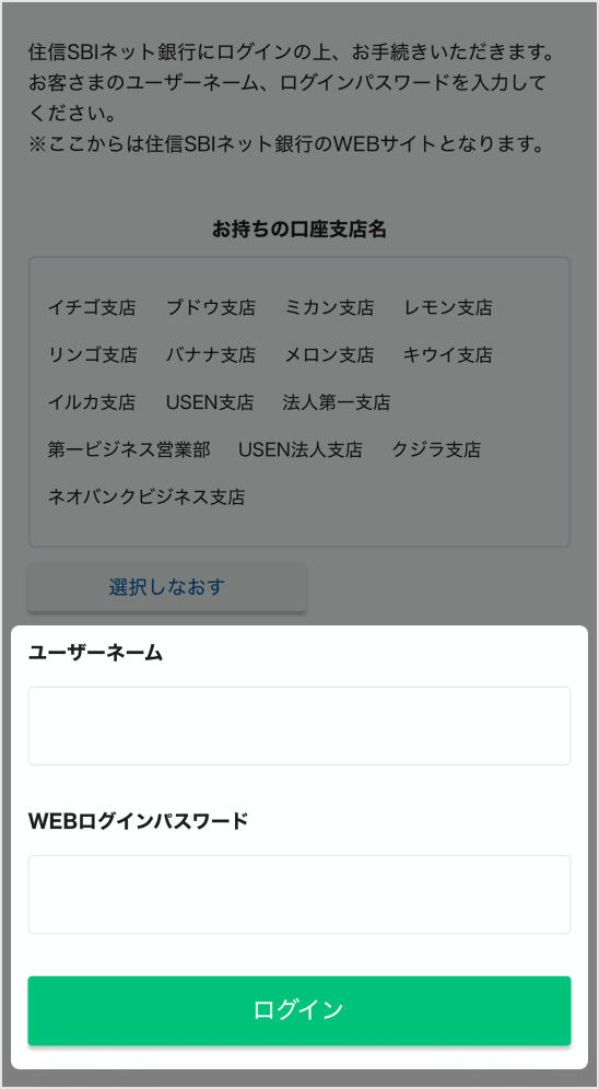 ユーザーネーム、WEBログインパスワードを入力し、「ログイン」をタップしてください。