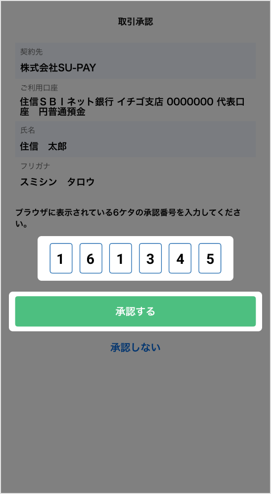 当社銀行アプリを起動し、承認番号を入力。「承認する」をタップしてください。